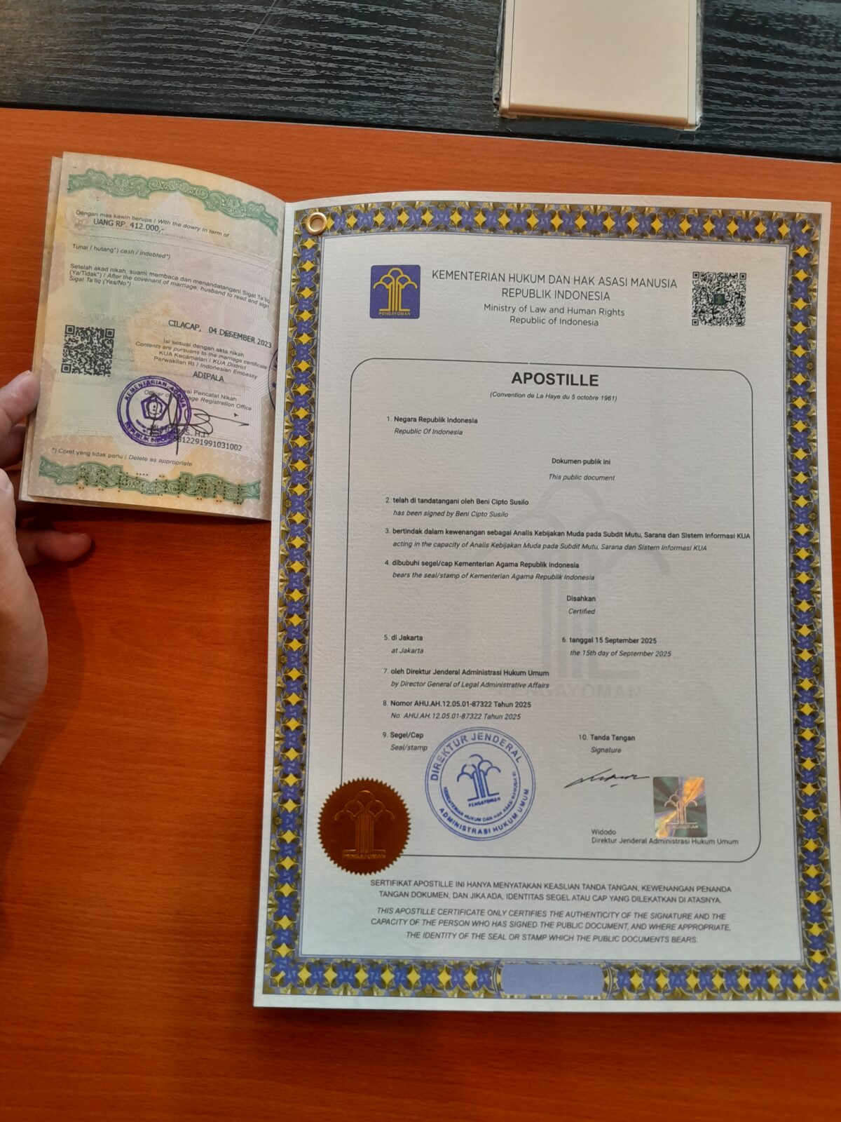 - Kutipan Akta Nikah asli dan foto copy yg di apostille Kemenkumham